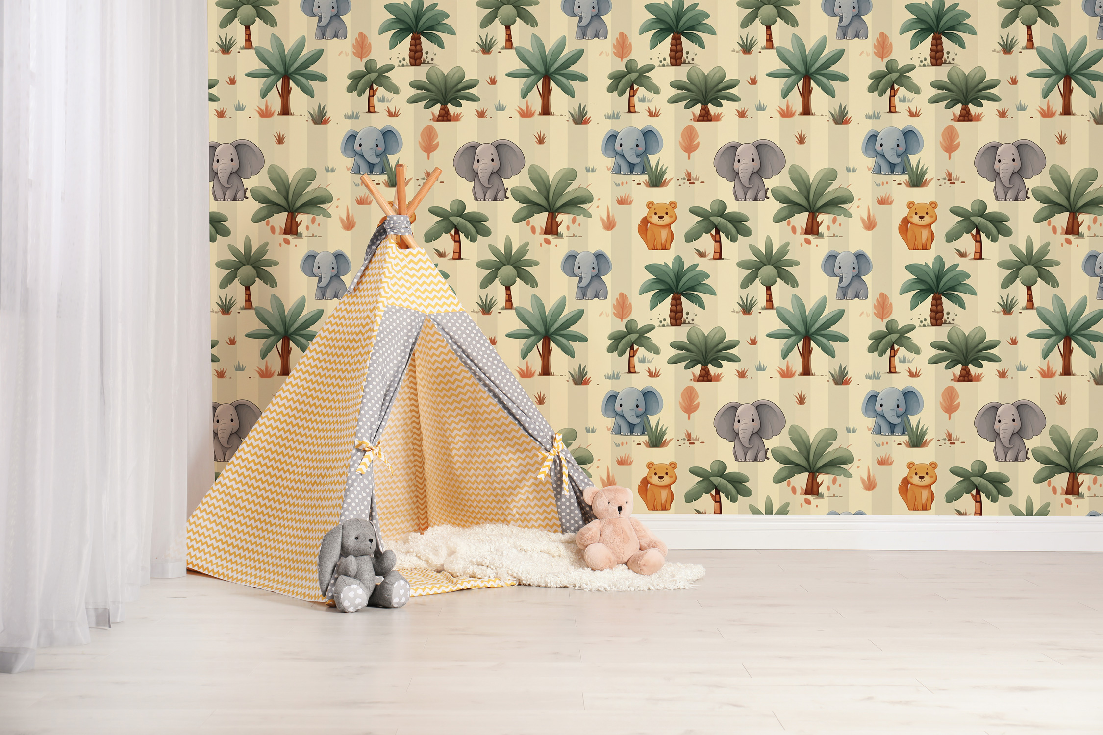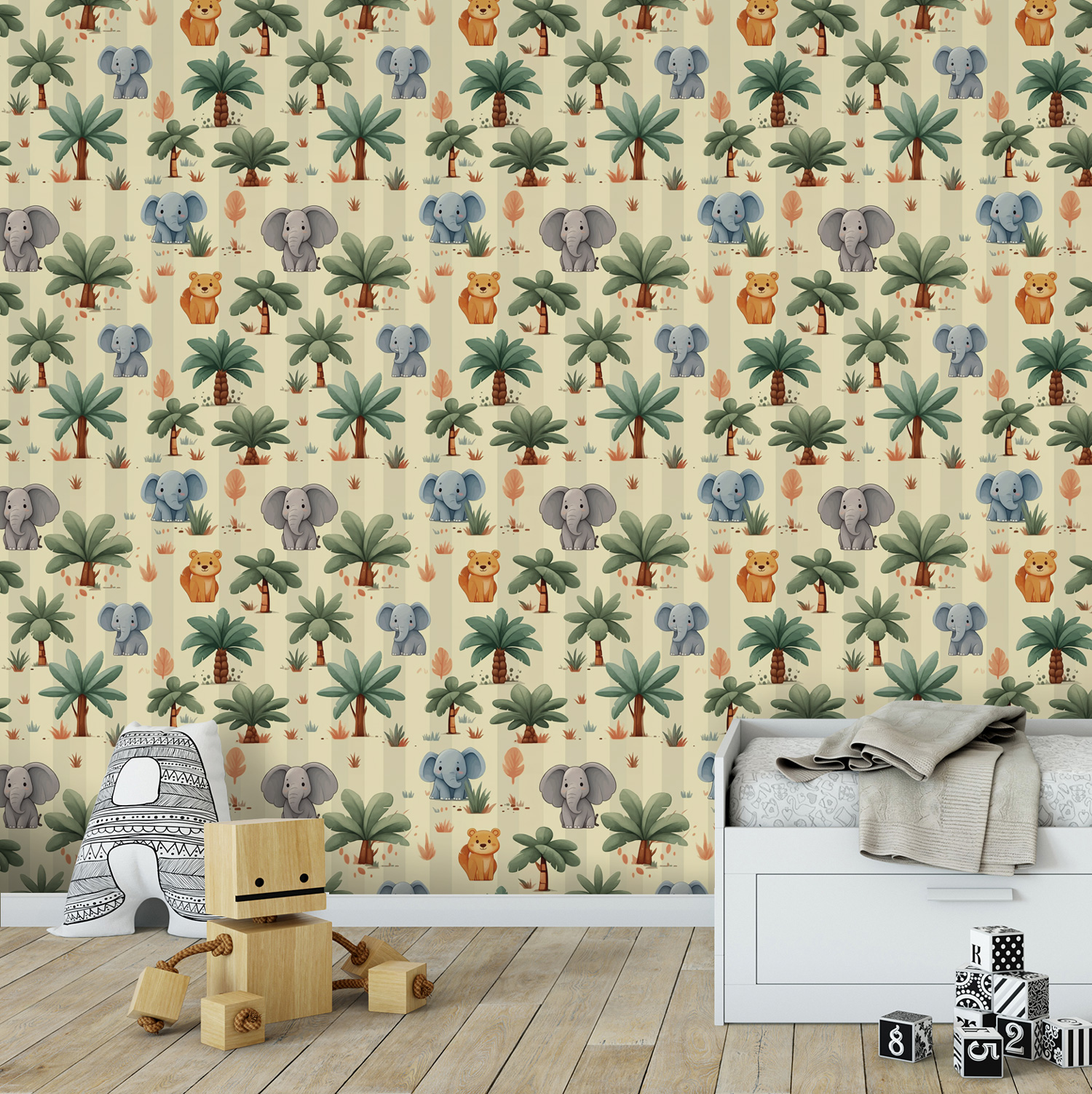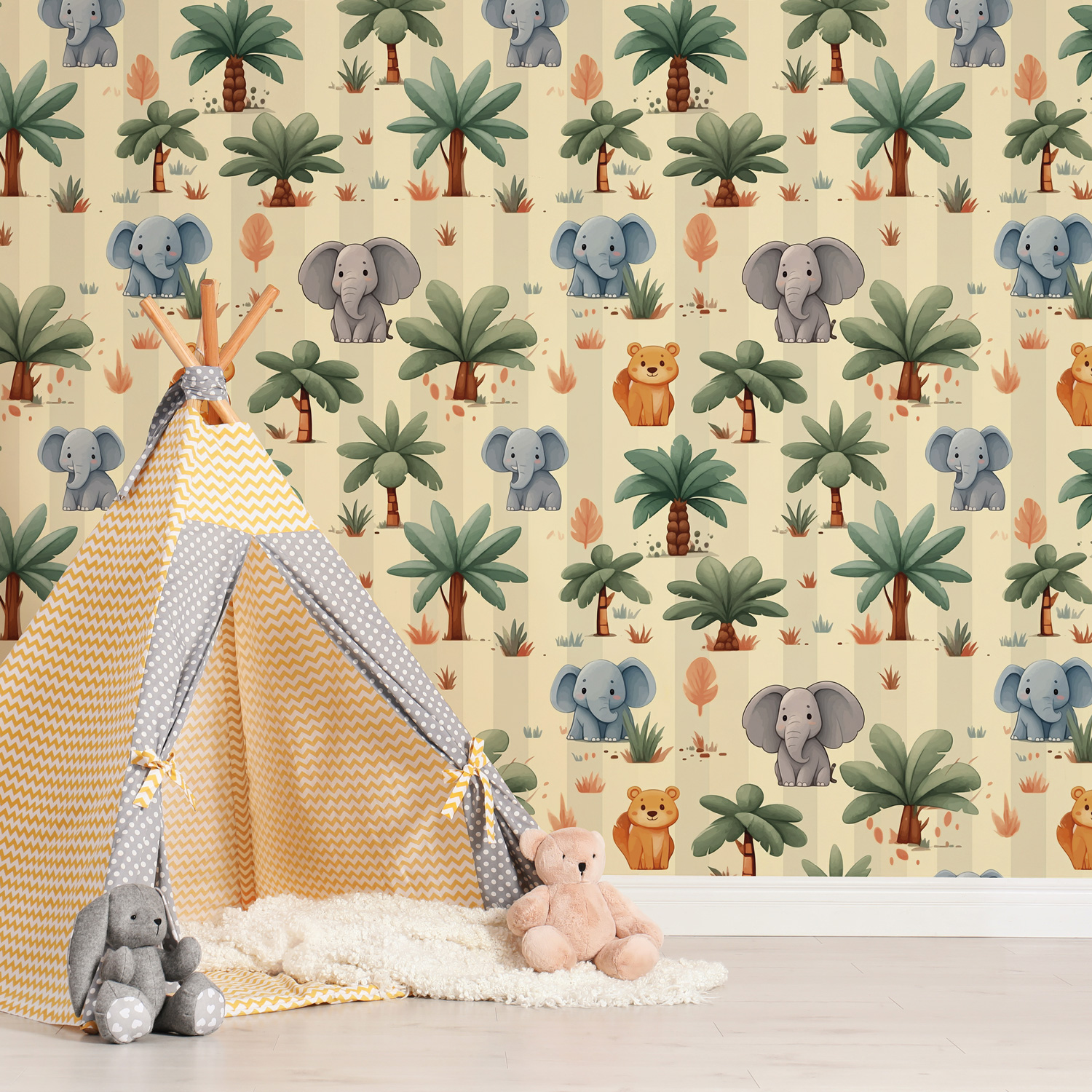 Plongez dans un monde enchanteur avec notre papier peint panoramique « Éléphanteaux ». Imaginez transformer votre espace en une jungle vibrante, où la douceur des éléphants se mêle à une palette multicolore éclatante.